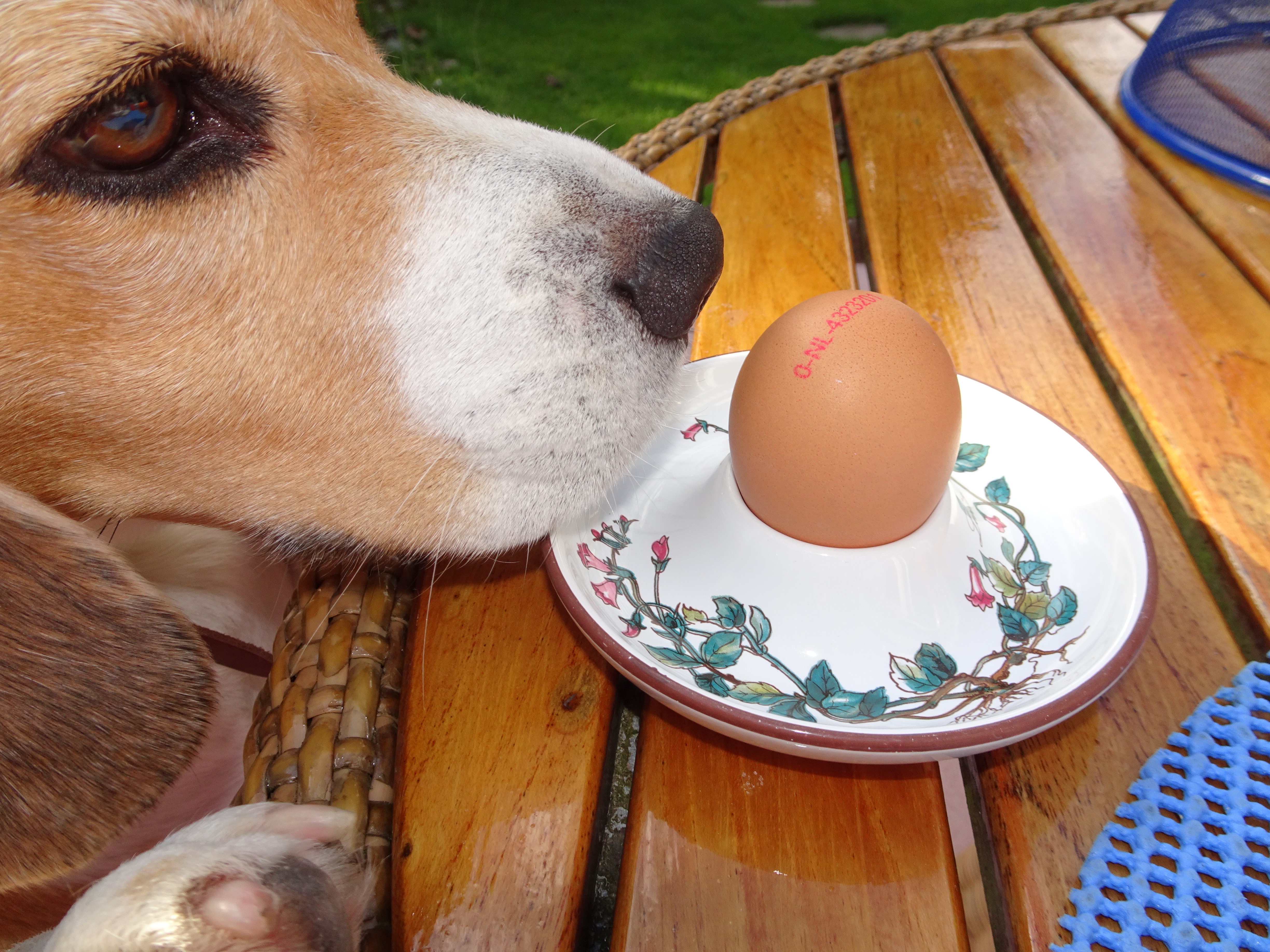 ‘Die krijg ik met rauwe eidooier een paar keer per week. Daar zit alles in. De mensenwereld is met de cholesterolmythe op het verkeerde been gezet, zodat ze weinig eieren eten. Gelukkig doen ze in de hondenwereld daar niet zo moeilijk over. Weet je dat ik ze soms met eierschaal en al eet? Het vrouwtje legt ze dan tien minuten in warm water, zonder te koken hoor, daarmee wordt de schaal zachter. Dat is net even lekkerder.’